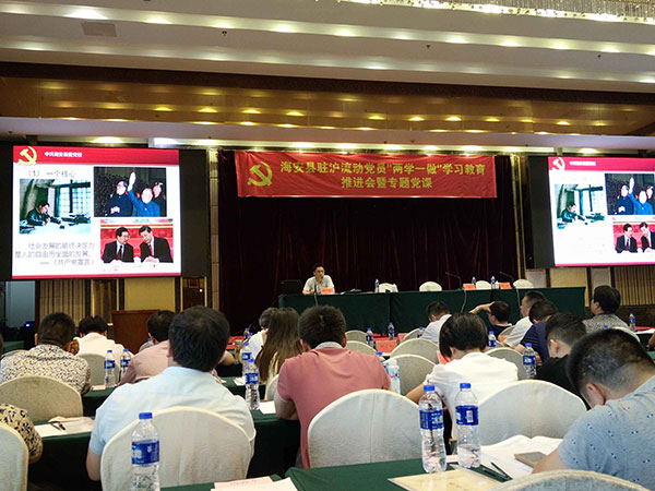 同時(shí),根據(jù)縣委組織部對(duì)“兩學(xué)一做”教育活動(dòng)的工作安排,“聯(lián)合黨委”于5月19日下午舉行“兩學(xué)一做”教育活動(dòng)專題黨課。“聯(lián)合黨委”書記李忠澤作“兩學(xué)一做”動(dòng)員報(bào)告,海安縣委黨校常務(wù)副校長(zhǎng)徐進(jìn)、副校長(zhǎng)程衛(wèi)國(guó)分別作“學(xué)習(xí)黨章、學(xué)習(xí)系列講話”專題黨課,海安籍在滬流動(dòng)黨員近400人參加活動(dòng)。