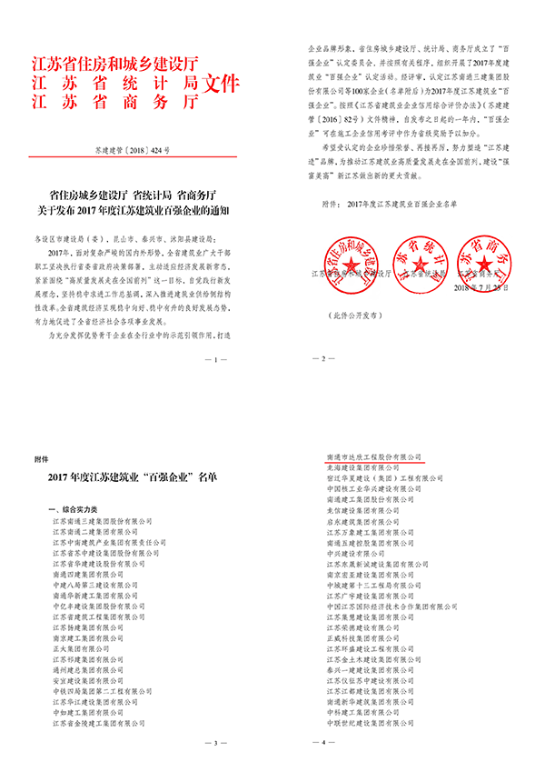 江蘇建筑業(yè)“百強(qiáng)企業(yè)”是由省建設(shè)廳、省統(tǒng)計(jì)局、省商務(wù)廳成立的“百強(qiáng)企業(yè)”認(rèn)定委員會(huì)評議認(rèn)定,從企業(yè)營業(yè)額等經(jīng)濟(jì)類指標(biāo)、質(zhì)量安全、技術(shù)創(chuàng)新指標(biāo)等方面進(jìn)行綜合評定,旨在充分發(fā)揮優(yōu)勢企業(yè)在全行業(yè)中的引領(lǐng)和示范作用,打造建筑企業(yè)品牌,提升核心競爭力,是權(quán)威性的政府評選。同時(shí)按照《江蘇省建筑業(yè)企業(yè)信用綜合評價(jià)辦法》(蘇建建管〔2016〕82號)文件精神,自發(fā)布之日起的一年內(nèi),“百強(qiáng)企業(yè)”可在施工企業(yè)信用考評中作為省級獎(jiǎng)勵(lì)予以加分。