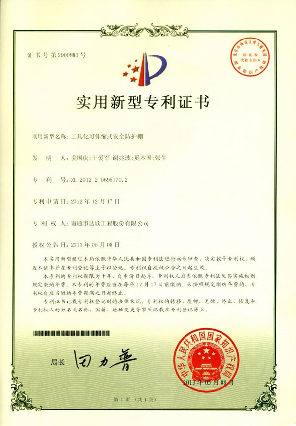 成果二提出了一種建筑施工現(xiàn)場(chǎng)用工具化可伸縮式的安全防護(hù)棚,將防護(hù)棚由通常的整體式結(jié)構(gòu)改成單元式、定型化、工具式結(jié)構(gòu),可根據(jù)場(chǎng)地需要組合成多種尺寸,且所有構(gòu)件單元可重復(fù)周轉(zhuǎn)使用,整體安裝方便快捷,從而提高各類安全防護(hù)棚的安裝速度和安全性,能較好的滿足施工現(xiàn)場(chǎng)的標(biāo)準(zhǔn)化、規(guī)范化、安全文明施工的要求,推進(jìn)了科技進(jìn)步。