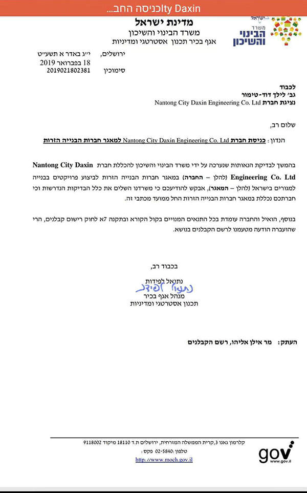 近年來,達欣集團積極響應(yīng)國家“走出去”和“一帶一路”戰(zhàn)略,大力發(fā)展國際工程承包業(yè)務(wù),此次中標以色列承包商資格,將為集團進一步拓展海外市場提供新的契機。