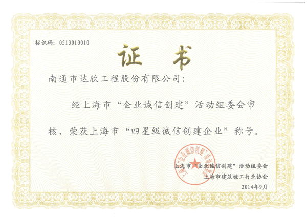 日前,由上海市建筑施工行業(yè)協(xié)會推薦,上海市“企業(yè)誠信創(chuàng)建”活動組委會審核,第三方征信機構嚴格查證,第一工程公司在2013年榮獲“三星級誠信創(chuàng)建企業(yè)”后,今年再加一顆星,被授予上海市“四星級誠信創(chuàng)建企業(yè)”稱號。