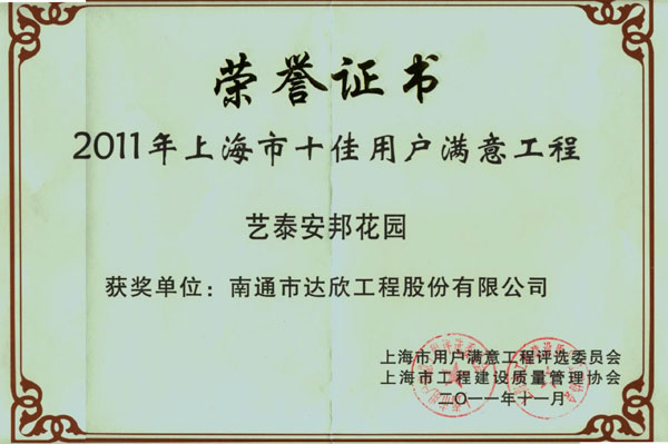 上海市“十佳用戶(hù)滿意工程”是上海市建筑業(yè)重量級(jí)獎(jiǎng)項(xiàng),是上海市在建的大型工程中,通過(guò)業(yè)主等部門(mén)使用后,選出十五項(xiàng)質(zhì)量?jī)?yōu)秀、后期運(yùn)行穩(wěn)定、服務(wù)質(zhì)量?jī)?yōu)秀的工程為候選單位,并在十五項(xiàng)候選工程中選出十項(xiàng)通過(guò)專(zhuān)家評(píng)審,方可獲得上海市“十佳用戶(hù)滿意工程”獎(jiǎng)。獲此獎(jiǎng)項(xiàng)標(biāo)志著達(dá)欣公司進(jìn)滬施工的信譽(yù)和業(yè)績(jī)提高到了一個(gè)更高層次,必將對(duì)持續(xù)經(jīng)營(yíng)開(kāi)發(fā)起到良好的社會(huì)影響。
