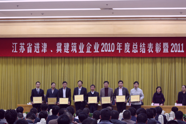 2011年3月20日,江蘇省進津、冀建筑業(yè)企業(yè)2010年度總結(jié)表彰暨2011年工作大會在天津大禮堂隆重召開。大會由江蘇省建設廳駐天津辦事處副主任韓勁松主持,主任鄧福林作了“搶抓新機遇,謀劃新發(fā)展,不斷開創(chuàng)江蘇建筑業(yè)新局面”的工作報告,對2010年的工作進行回顧,并提出2011年工作目標任務。江蘇省建筑工程管理局副局長紀迅、天津市外地施工隊伍管理站站長吳海、江蘇省住房和城鄉(xiāng)建設廳監(jiān)察室主任王毅、計劃賬務處調(diào)研員徐和美等江蘇省、天津市的主管部門領導應邀出席了會議,紀迅局長、吳海站長作了重要講話。