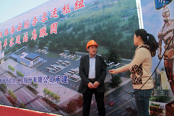 在開工儀式后,馬董事長現場接受了海安電視臺的采訪,代表公司向全縣人民承諾,要把本項目作為公司的重點工程、形象工程展示給全縣人民,做到抓質量精益求精,抓進度一絲不茍,抓安全防微杜漸,以一流的素質,一流的服務,一流的技術,打造出優(yōu)質的精品工程回饋家鄉(xiāng)人民。